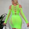 Swing your hips in this eye-catching fishnet mini dress featuring a high neckline, sheer cups, long fitted sleeves, and a curve-hugging fit.